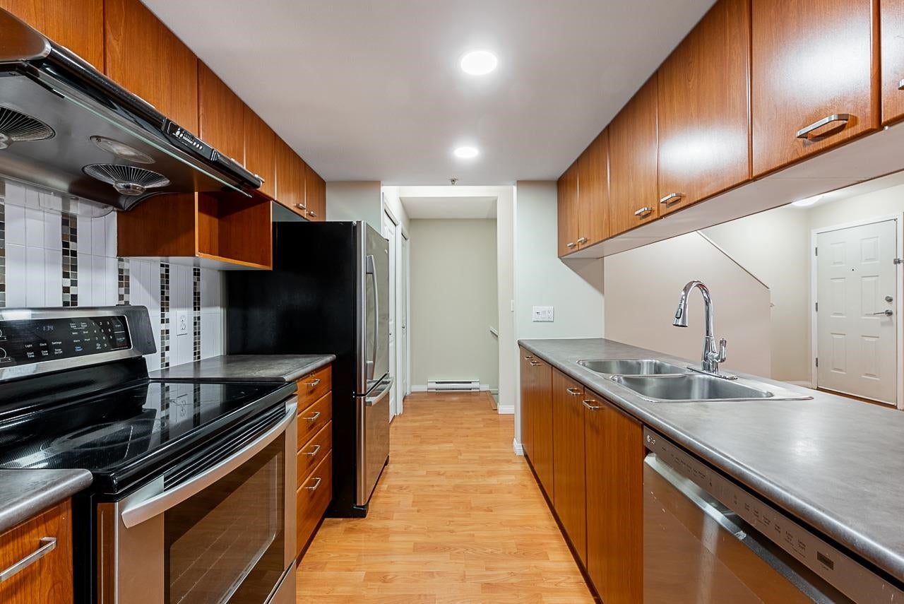 RAINSCREENED! Rare CORNER 3 bedroom, 3 full bath, 1,520+ sqft townhouse in the heart of New West! Modern open-concept main flr w/kitchen overlooking spacious living room and separate dining room, flooded with natural light and added matching cabinetry for extra storage. Upstairs: 2 bedrooms include primary with walk-in closet and ensuite plus 2nd bedroom near main bath and laundry. Downstairs: large bedroom with separate entry, full bath, rec/flex space and direct parkade access. Outdoor living with porch and patio. Gated, well-managed complex 15 mins walk to SkyTrain (6 mins by bus), Douglas College, shops, restaurants, schools and Tipperary Park’s Farmer’s Market!
